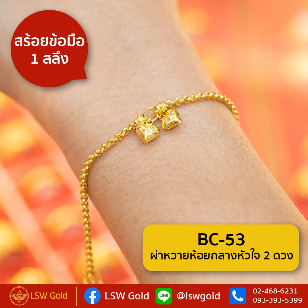 สร้อยข้อมือทองคำแท้ 1 สลึง (3.79 กรัม) ลายผ่าหวายห้อยกลางหัวใจ 2 ดวง BC-53